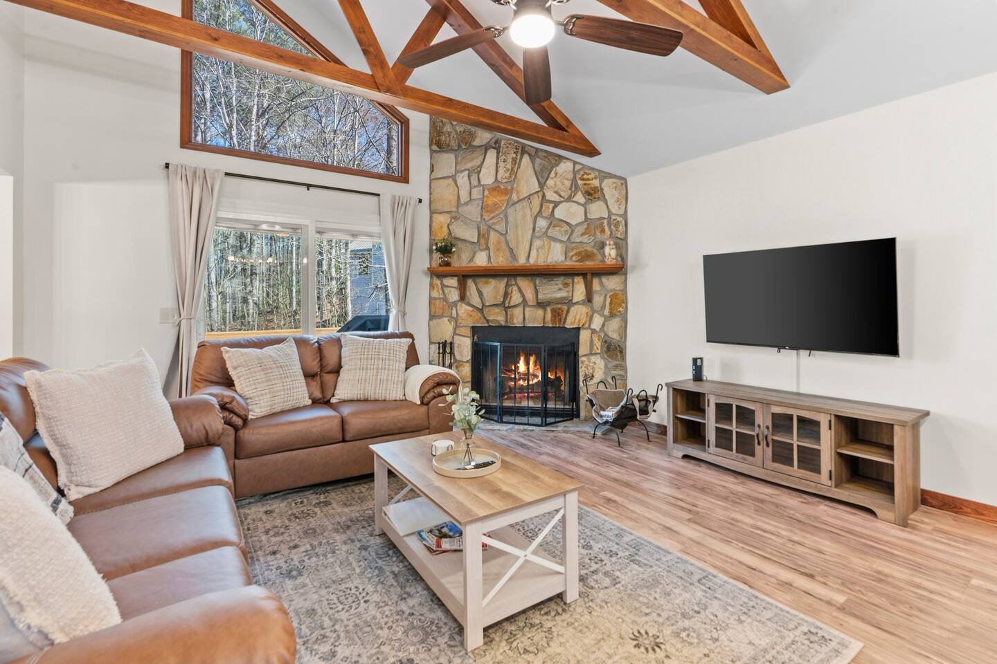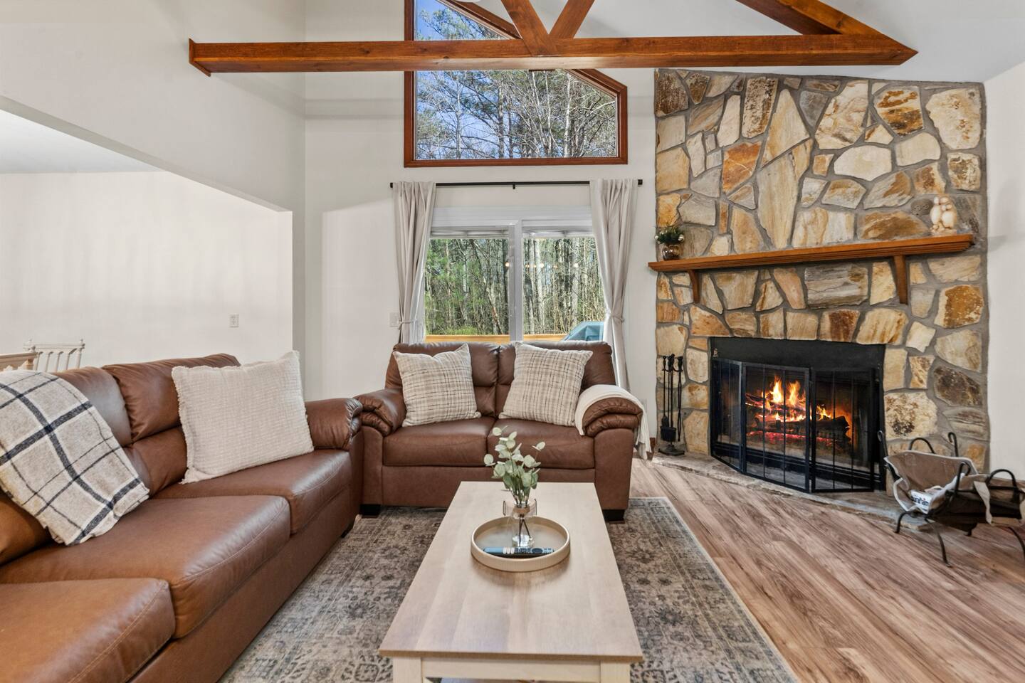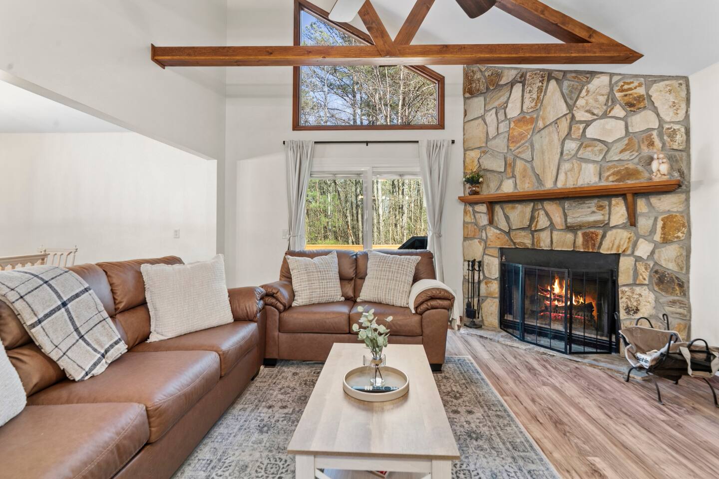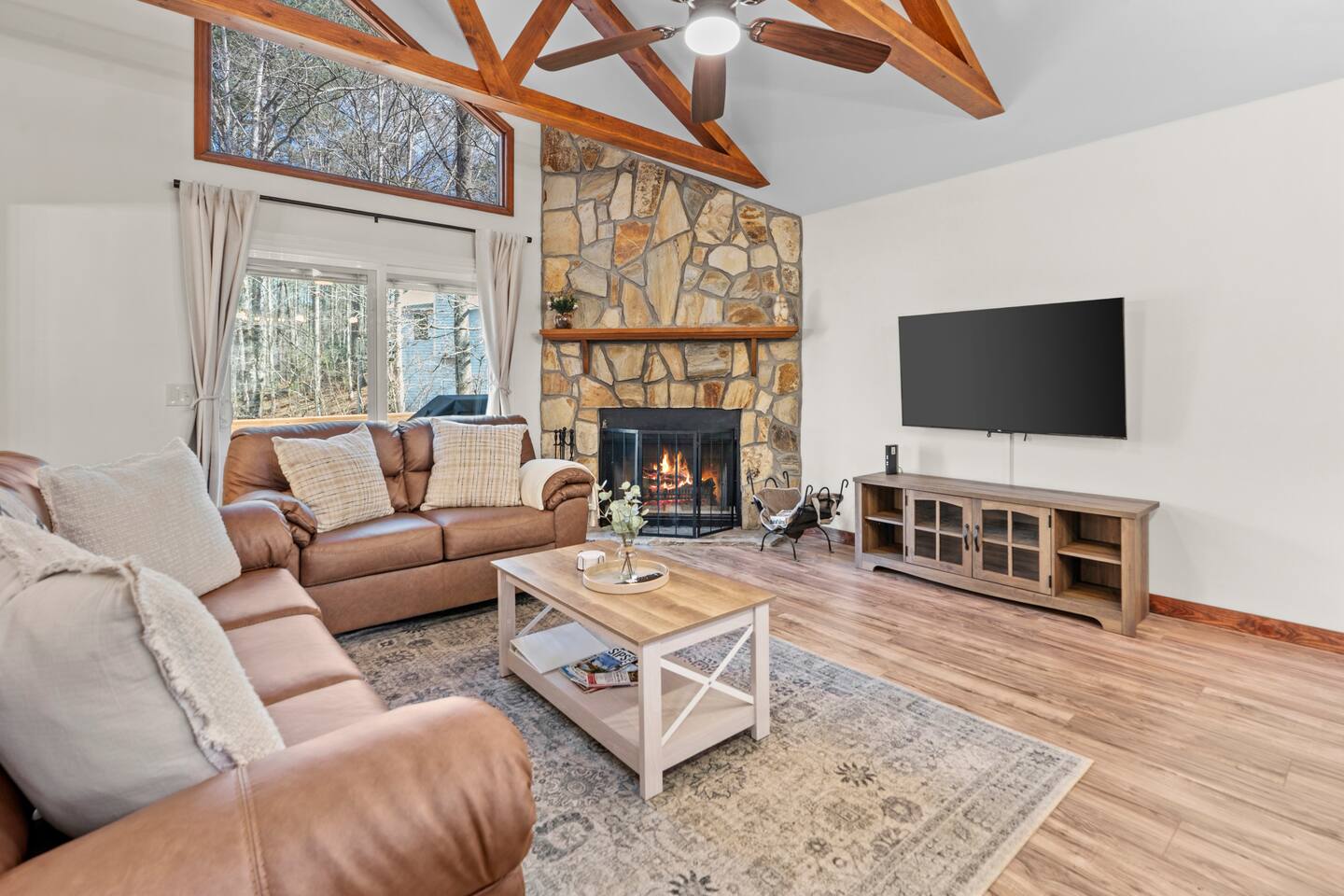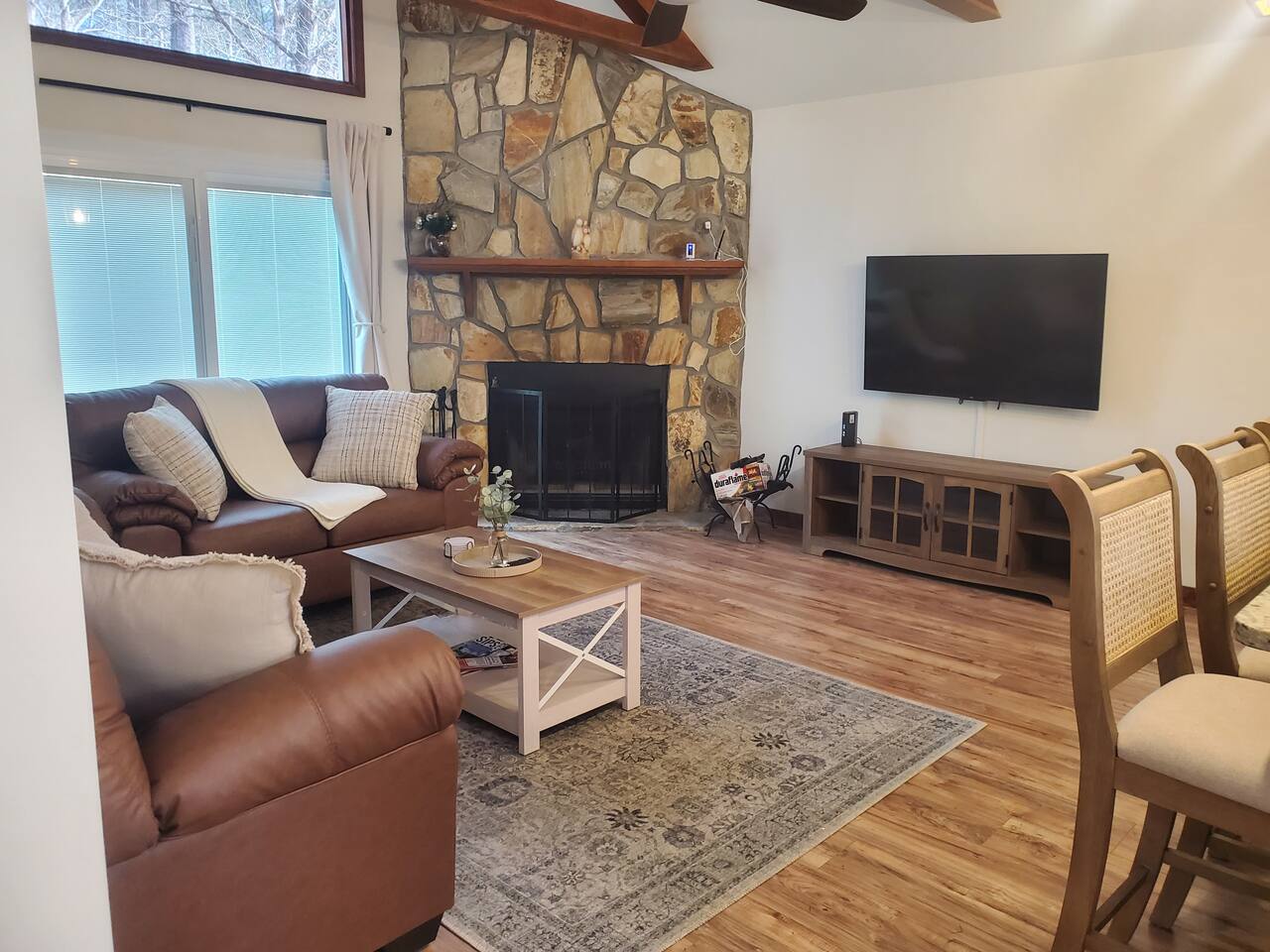 AMENITIES @ OWL & EMBER ⭐️Free access to all of Coosawatee River Resort's Amenites! (INDOOR POOL OPEN ALL YEAR!) 👶Family Friendly 🔥 Wood Burning Fireplace 🍔 Propane Grill ☕️ Keurig & drip coffee maker 🛜High speed WiFi 👩🍳Fully stocked kitchen 📺3 Smart TV's 🧺Washer & Dryer 💼Desk and Comfy Office Chair LIVING ROOM: -Smart TV -Woodburning fireplace for those cozy winter days -Games for all ages! KITCHEN & DINING: - Keurig and a drip coffee maker and a hot cocoa bar! -4 burner propane stovetop with griddle -Fully stocked so you can whip up your favorite home cooked meal -Dining table for 6 with 3 additional chairs at the kitchen island -Hot Water Kettle--Toaster--Kids Dinnerware--Blender--Wine Glasses--Cleaning Products--Food Containers--Ceramic Dining Set--Slow Cooker--Rice Cooker--Measuring Cups--Mixing Bowls--Baking Pans--Muffin Tin--and so much more! SLEEPING ARRANGEMENTS: *Main Floor-No stairs required! --King bed with ensuite bathroom with a walk in shower and double vanity (laundry is also in this room), smart TV & corner wardrobe *Upstairs: --King bed with desk workspace, smart TV & two closets --Two twin beds with closet BATHROOMS: We supply bath towels, hand towels, makeup towels, a hair dryer, shampoo, conditioner and body wash in both bathrooms. Main level bathroom: --Walk in shower --Double Vanity --Hair dryer Upstairs bathroom: --Tub/Shower combo --Double Vanity --Hair dryer **Upstairs bathroom is in the hallway and shared by the upstairs King & Twin bedroom. OUTDOOR SPACE: Grill out and enjoy a meal on our private back porch overlooking the beautiful greenery and small creek running through our backyard. **Parking space for 2 cars. COOSAWATEE RIVER RESORT: 5,500 acre resort with jam packed amenities: Indoor heated pool (OPEN ALL YEAR!), two outdoor pools (OPEN MEMORIAL-LABOR DAY), river access for tubing and kayaking, stocked fishing pond (fishing license required), fitness center, tennis courts, pickleball courts, basketball courts, mini golf course, game room with arcade and pool tables, picnic areas with grills, playgrounds, dog park, nature trails, 24/7 gated security, on-site general store, clubhouse lounge areas, scheduled activities and events. NEARBY ATTRACTIONS ✨Grapes and Ladders Vineyard-6 mins ✨Engelheim Vineyards-9 mins ✨Carters Lake-15 mins ✨Boat Ramp @ Carters Lake-5 miles away ✨Downtown Ellijay-15 mins ✨Cartecay River Experience-15 mins ✨Red Apple Barn-17 mins ✨R & A Orchards -19 mins ✨B.J. Reece Orchards-23 mins ✨Expedition: Bigfoot Museum -23 mins ✨Hillcrest Orchards -24 mins ✨Cartecay Vineyards-24 mins ✨Mountain Valley Farm Store -24 mins ✨Blue Ridge-30 mins ✨Amicalola Falls State Park-35 mins