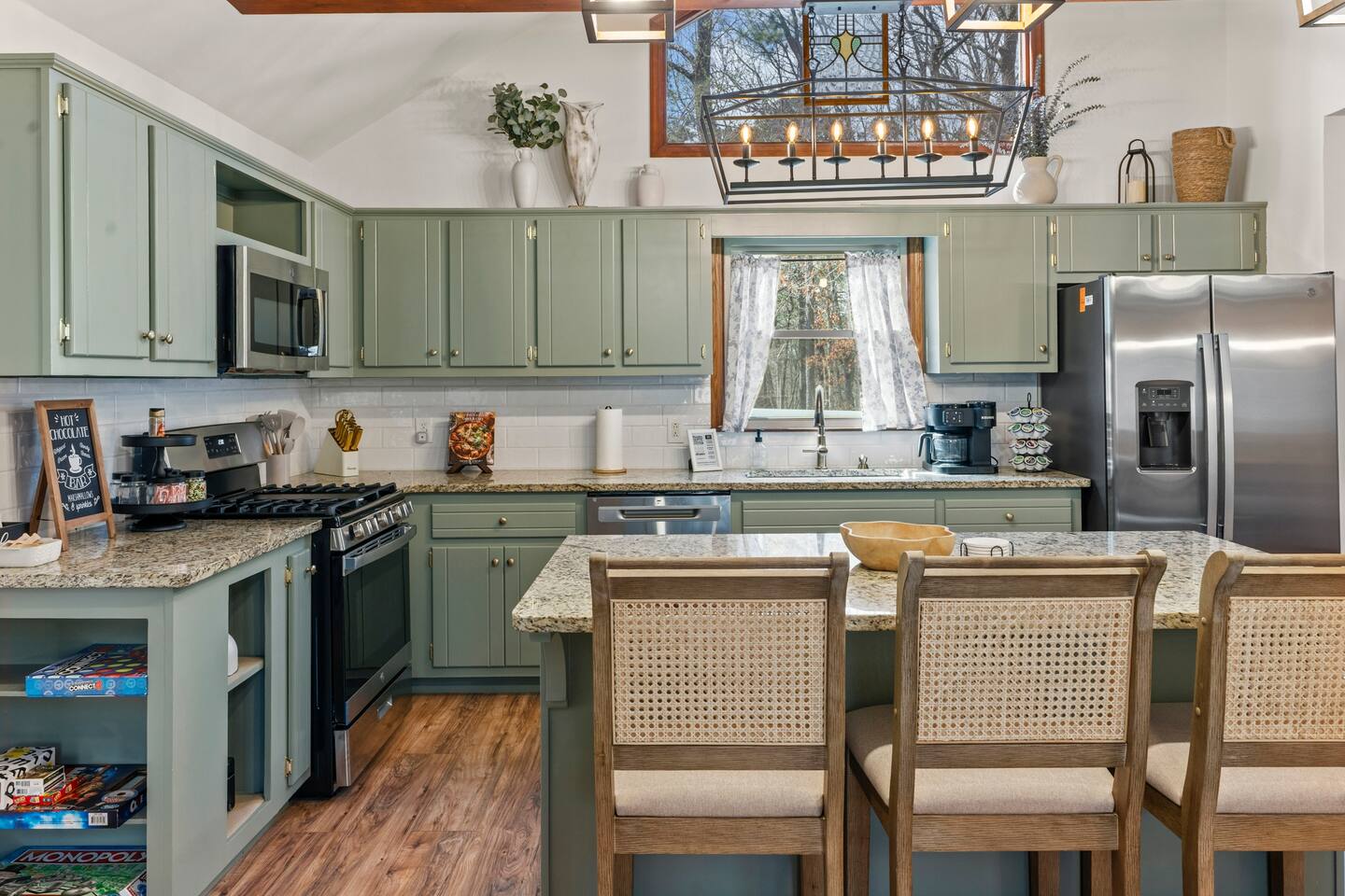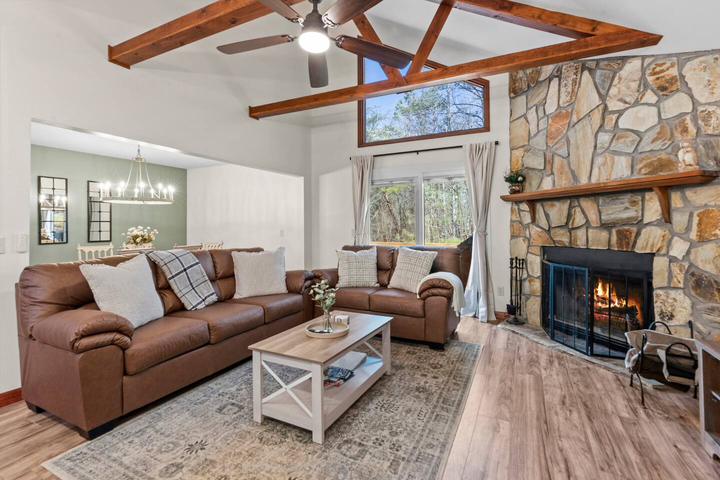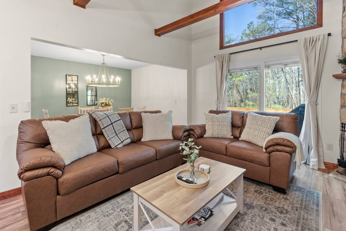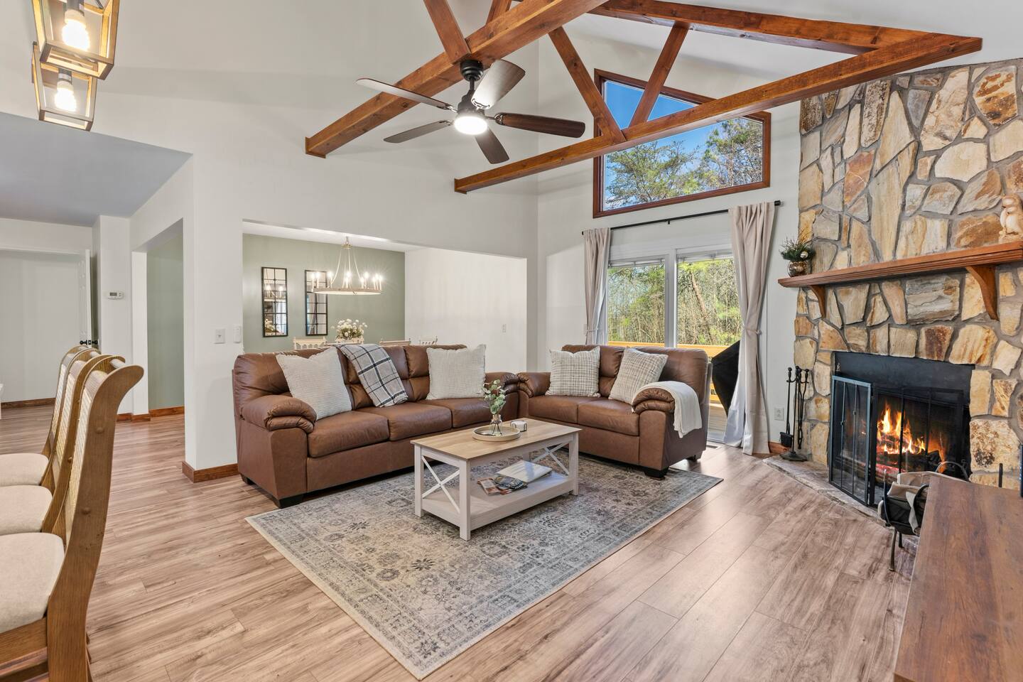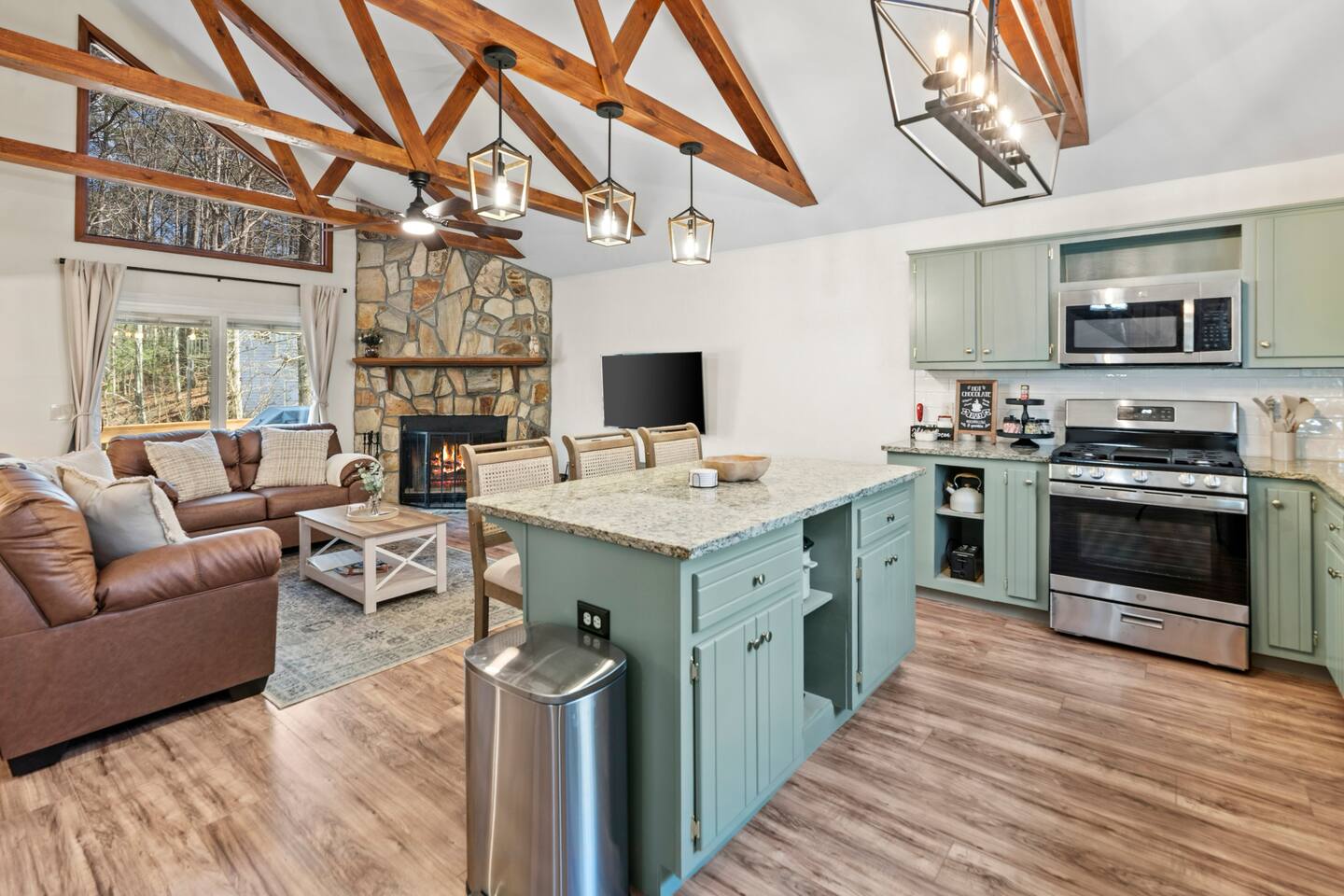 AMENITIES @ OWL & EMBER ⭐️Free access to all of Coosawatee River Resort's Amenites! (INDOOR POOL OPEN ALL YEAR!) 👶Family Friendly 🔥 Wood Burning Fireplace 🍔 Propane Grill ☕️ Keurig & drip coffee maker 🛜High speed WiFi 👩🍳Fully stocked kitchen 📺3 Smart TV's 🧺Washer & Dryer 💼Desk and Comfy Office Chair LIVING ROOM: -Smart TV -Woodburning fireplace for those cozy winter days -Games for all ages! KITCHEN & DINING: - Keurig and a drip coffee maker and a hot cocoa bar! -4 burner propane stovetop with griddle -Fully stocked so you can whip up your favorite home cooked meal -Dining table for 6 with 3 additional chairs at the kitchen island -Hot Water Kettle--Toaster--Kids Dinnerware--Blender--Wine Glasses--Cleaning Products--Food Containers--Ceramic Dining Set--Slow Cooker--Rice Cooker--Measuring Cups--Mixing Bowls--Baking Pans--Muffin Tin--and so much more! SLEEPING ARRANGEMENTS: *Main Floor-No stairs required! --King bed with ensuite bathroom with a walk in shower and double vanity (laundry is also in this room), smart TV & corner wardrobe *Upstairs: --King bed with desk workspace, smart TV & two closets --Two twin beds with closet BATHROOMS: We supply bath towels, hand towels, makeup towels, a hair dryer, shampoo, conditioner and body wash in both bathrooms. Main level bathroom: --Walk in shower --Double Vanity --Hair dryer Upstairs bathroom: --Tub/Shower combo --Double Vanity --Hair dryer **Upstairs bathroom is in the hallway and shared by the upstairs King & Twin bedroom. OUTDOOR SPACE: Grill out and enjoy a meal on our private back porch overlooking the beautiful greenery and small creek running through our backyard. **Parking space for 2 cars. COOSAWATEE RIVER RESORT: 5,500 acre resort with jam packed amenities: Indoor heated pool (OPEN ALL YEAR!), two outdoor pools (OPEN MEMORIAL-LABOR DAY), river access for tubing and kayaking, stocked fishing pond (fishing license required), fitness center, tennis courts, pickleball courts, basketball courts, mini golf course, game room with arcade and pool tables, picnic areas with grills, playgrounds, dog park, nature trails, 24/7 gated security, on-site general store, clubhouse lounge areas, scheduled activities and events. NEARBY ATTRACTIONS ✨Grapes and Ladders Vineyard-6 mins ✨Engelheim Vineyards-9 mins ✨Carters Lake-15 mins ✨Boat Ramp @ Carters Lake-5 miles away ✨Downtown Ellijay-15 mins ✨Cartecay River Experience-15 mins ✨Red Apple Barn-17 mins ✨R & A Orchards -19 mins ✨B.J. Reece Orchards-23 mins ✨Expedition: Bigfoot Museum -23 mins ✨Hillcrest Orchards -24 mins ✨Cartecay Vineyards-24 mins ✨Mountain Valley Farm Store -24 mins ✨Blue Ridge-30 mins ✨Amicalola Falls State Park-35 mins